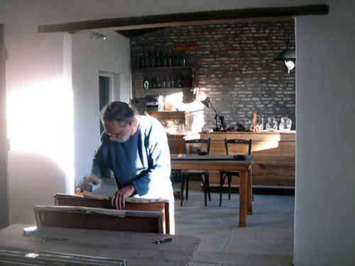 con las mesas y sillas sobre el entoscado. Rubén Resch y Johnny