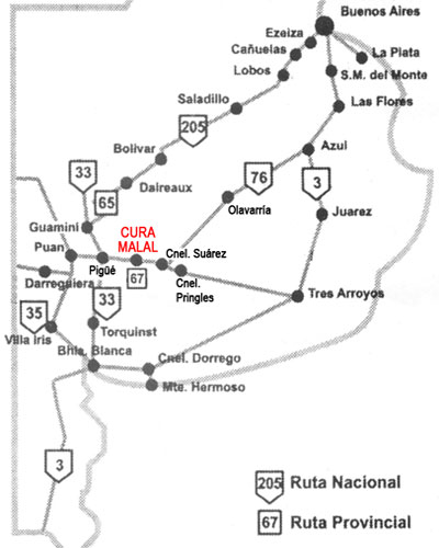 By car About 540 km. First take highway 3. From Buenos Aires city, taking the expressway to Ezeiza, till reaching the Cañuelas roundabout, then highway 205 to Saladillo, south westward. Once in Bolívar, take interstate highway 65 to Daireaux and, after reaching Guaminí, take interstate highway 85 to Coronel Suárez.