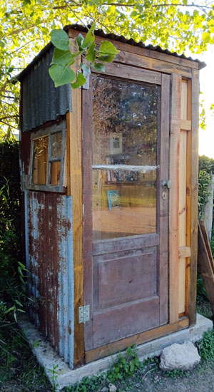 biblioteca y cabina telefónica en la vereda de la calle Los Aromos