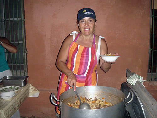 Mirta con su primer cuenco de guiso servido...